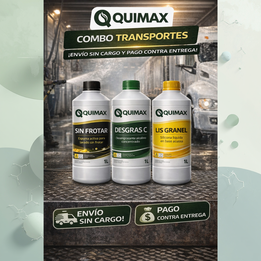 Optimizá el mantenimiento de tu flota y bajá tus costos operativos con el Combo Transportes de QUIMAX. El sistema de 3 pasos para que tus unidades salgan a la ruta rápido y brillando. 👇